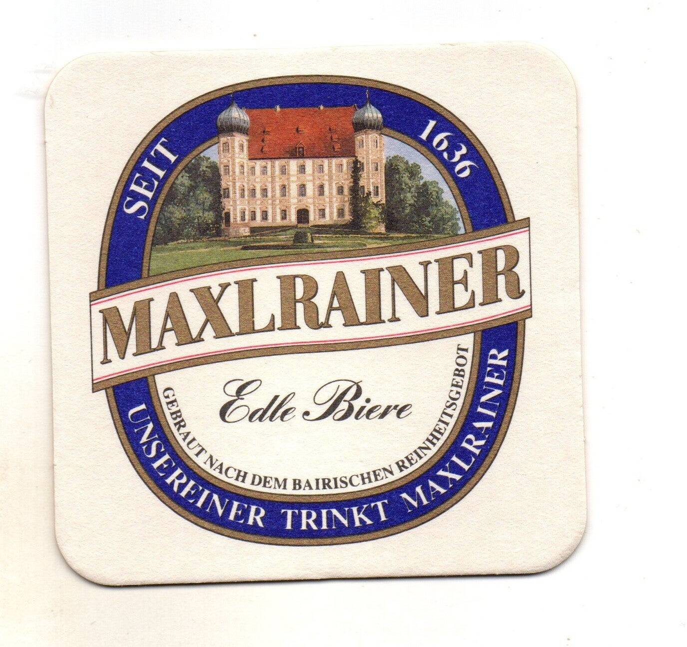 Sottobicchiere birra Maxlrainer, in cartoncino pressato monouso di forma quadrata. Dimensioni cm 9 per lato.