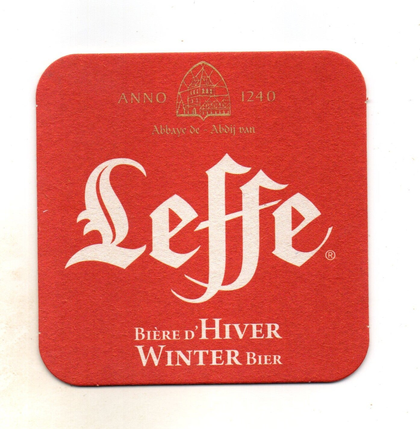 Sottobicchiere birra Leffe, in cartoncino pressato monouso di forma quadrata. Dimensioni cm 9 per lato.