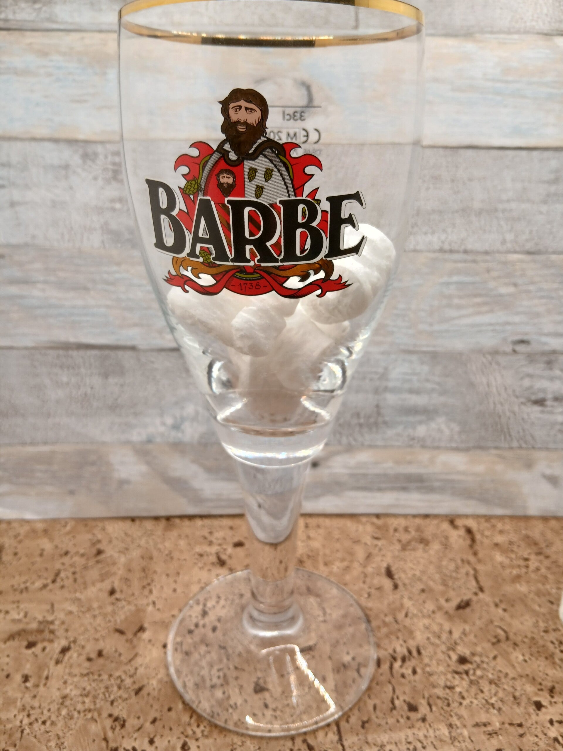 Bicchiere birra Barbe in vetro Ayano, calice a forma di flute con bordo dorato della capacità alla tacca di 33 cl. Altezza cm 22,5. Diametro apertura cm 7,5. Diametro base cm 8,5.