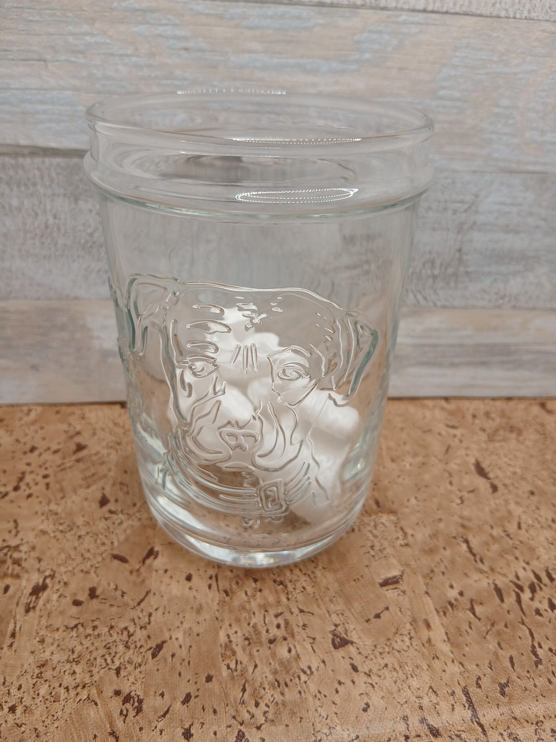 Sul fondo del bicchiere compare la scritta "Beer Speaks"; sui lati, da una parte compare la scritta "Large Smouth" e dall'altra, in rilievo, l'immagine di un cane di razza Staffordshire Terrier o American Pit Bull Terrier.